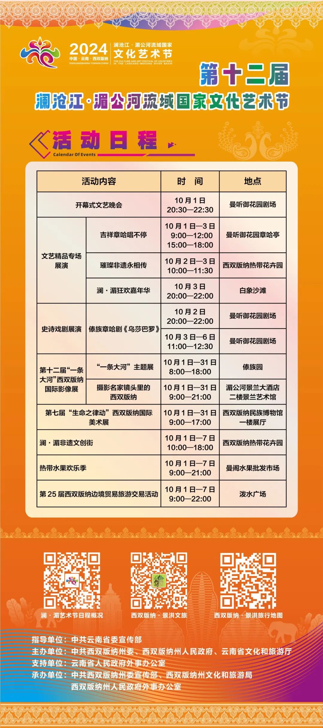 本届文化艺术节是澜沧江·湄公河流域艺术的大餐、文化的盛宴、购物的狂欢,集合了舞台艺术、摄影艺术、绘画艺术和非遗文创的展示,还同步开展旅游产品推介、边境商品交易等活动。
