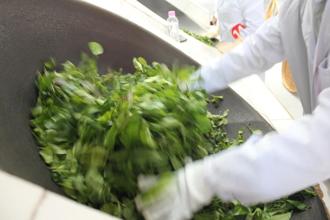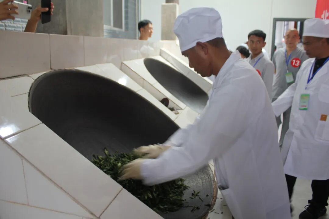 比赛现场,气氛紧张而热烈,参赛选手纷纷亮出自己的看家本领,他们在热气腾腾的炒锅内展示着精湛的技艺,鲜嫩的茶叶上下翻飞,茶叶的颜色和形状随着翻炒次数的增多而逐渐改变,凭借着独特的操作手法和精准的火候控制,茶叶的加工过程变得精准且高效,杀青、摊晾、揉捻等各环节都显示着各普洱茶制作技艺传承人高超的技艺与精益求精的精神,整个赛场弥漫着浓郁的茶香。
