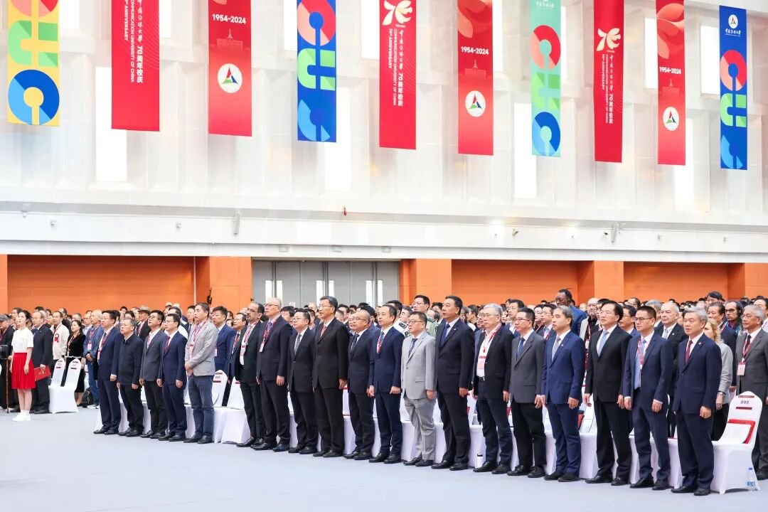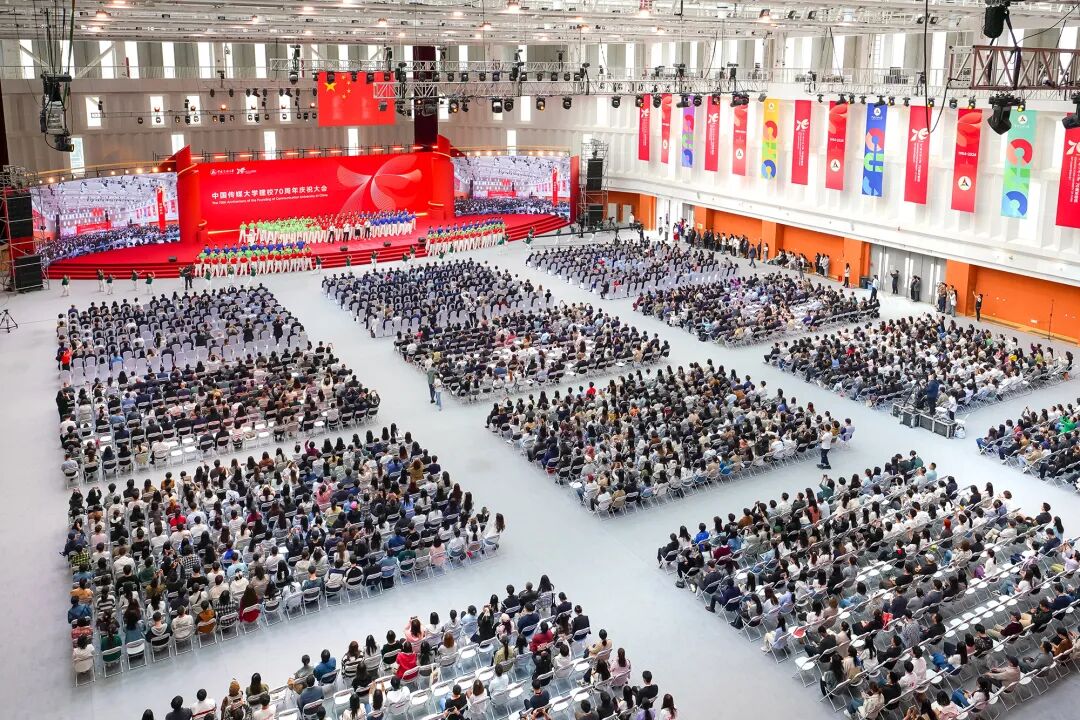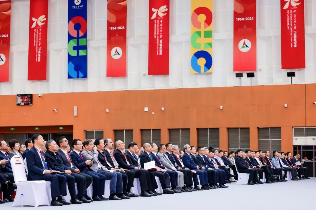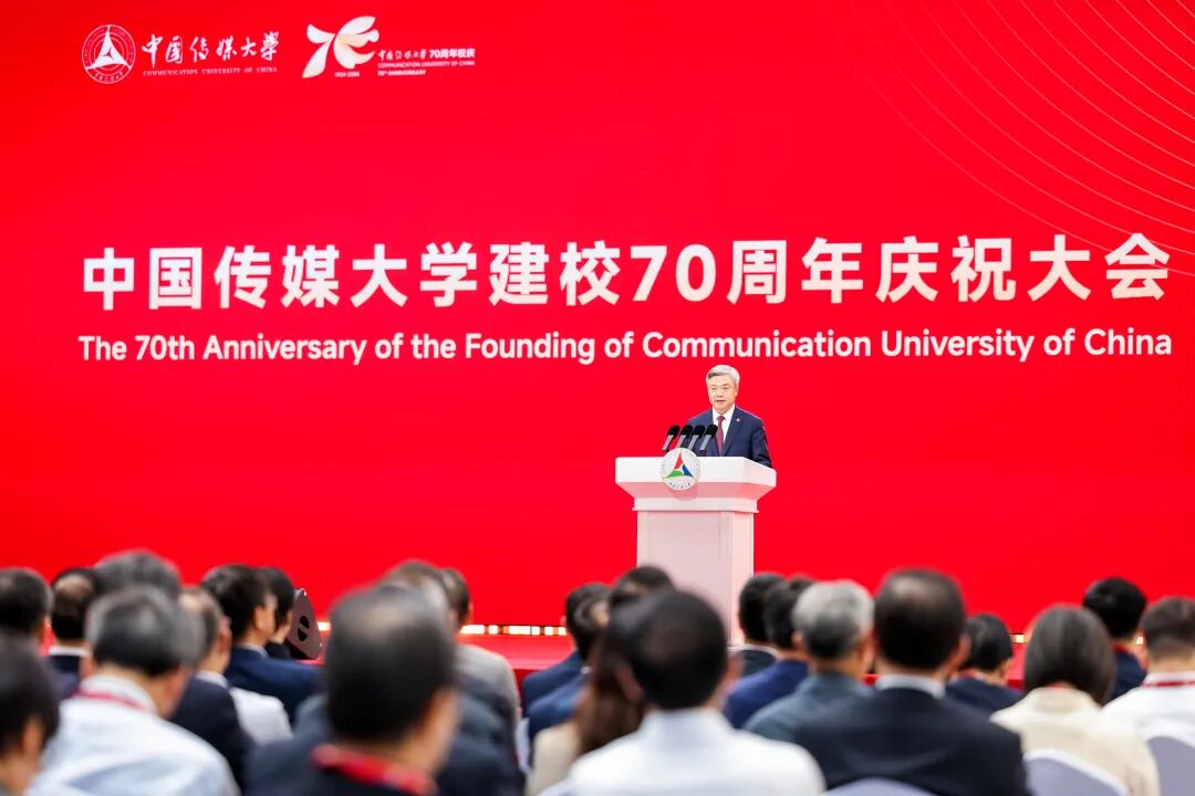中国传媒大学党委书记廖祥忠在大会致辞。他代表学校向各位领导、嘉宾、校友以及远道而来的百余名外国友人致以最热烈的欢迎!向那些曾经为学校发展呕心沥血的前辈们致以最崇高的敬意!向辛勤耕耘、默默奉献的全校师生员工,向长期以来关心和支持学校发展的社会各界致以最诚挚的谢意!廖祥忠表示,教育部怀进鹏部长宣读了习近平总书记给中传全体师生的重要回信,让我们心潮激荡、倍感振奋!这是中国传媒大学办学史上最具里程碑意义的大事!总书记的重要回信高屋建瓴、立意深远、催人奋进。总书记的关怀、信任与嘱托,是对学校70年发展史的肯定和期许,是传媒人的共同荣耀,更是学校站在70年的新起点接续奋进,潜心立德树人的根本遵循。我们一定要把这份沉甸甸的信任铭刻在心,把总书记的要求和嘱托贯穿到办学治校全过程各环节,化作新的奋进力量,以高度的政治自觉、思想自觉和行动自觉,答好总书记重要回信精神的答卷,以学校高质量发展的累累硕果回报总书记的关怀厚爱。