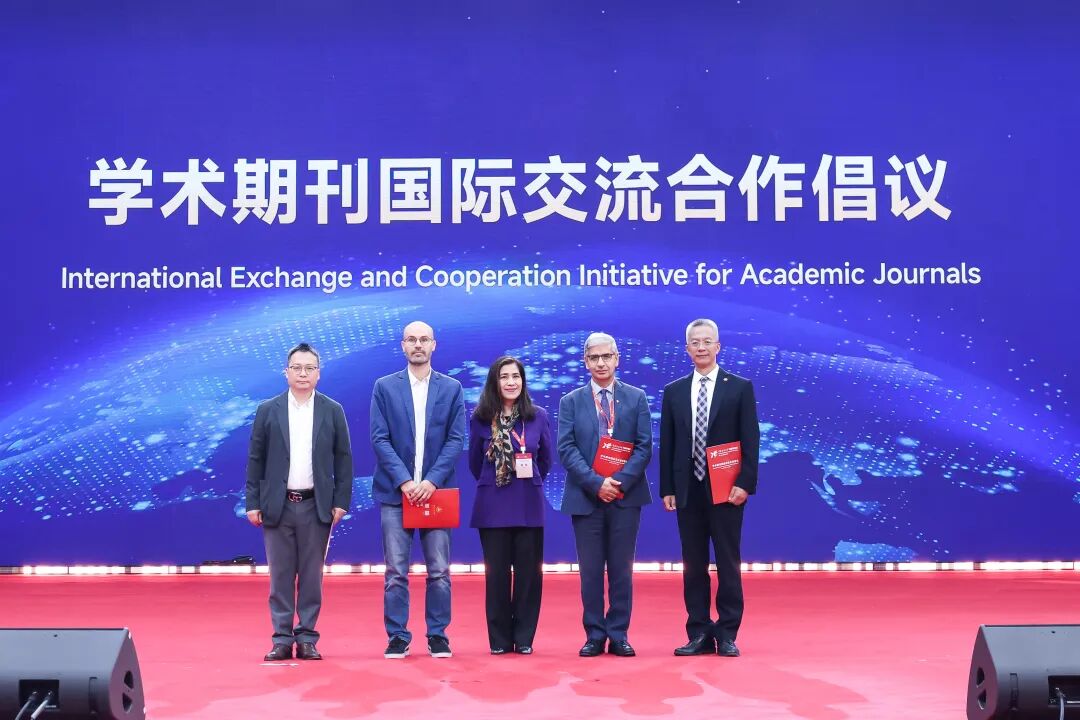 香港浸会大学教授、国际媒介与传播研究学会主席Daya Thussu,中国传媒大学副校长柴剑平,西班牙马德里康普顿斯大学教授、国际媒介与传播研究学会副主席Karen Arriaza Ibarra,意大利都灵大学副教授、英文期刊Media Culture & Society副主编Simone Natale,中国传媒大学教授、英文期刊Global Media and China编辑部主任黄典林共同宣读《学术期刊国际交流合作倡议》。倡议呼吁国内外传播领域相关期刊、集刊,站在构建人类命运共同体和推动全球文明交流互鉴的背景下,重视国际传播理论创新、自主知识体系构建、青年人才培养、刊物国际化建设、外文期刊建设、全球学术共同体打造。