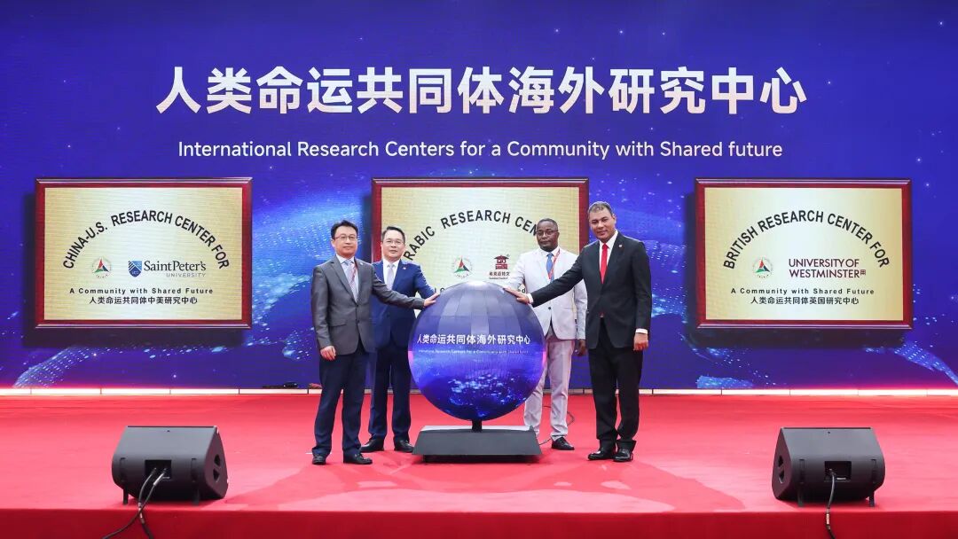 大会上举行了人类命运共同体中美研究中心、阿拉伯研究中心、英国研究中心揭牌仪式。人类命运共同体海外研究中心联合创办单位代表,中国传媒大学校长张树庭、美国圣彼得大学副校长朱卫东、埃及阿联酋希克迈特文化产业集团总裁白鑫、英国威斯敏斯特大学传播与媒体研究院教授Winston Mano共同揭牌。