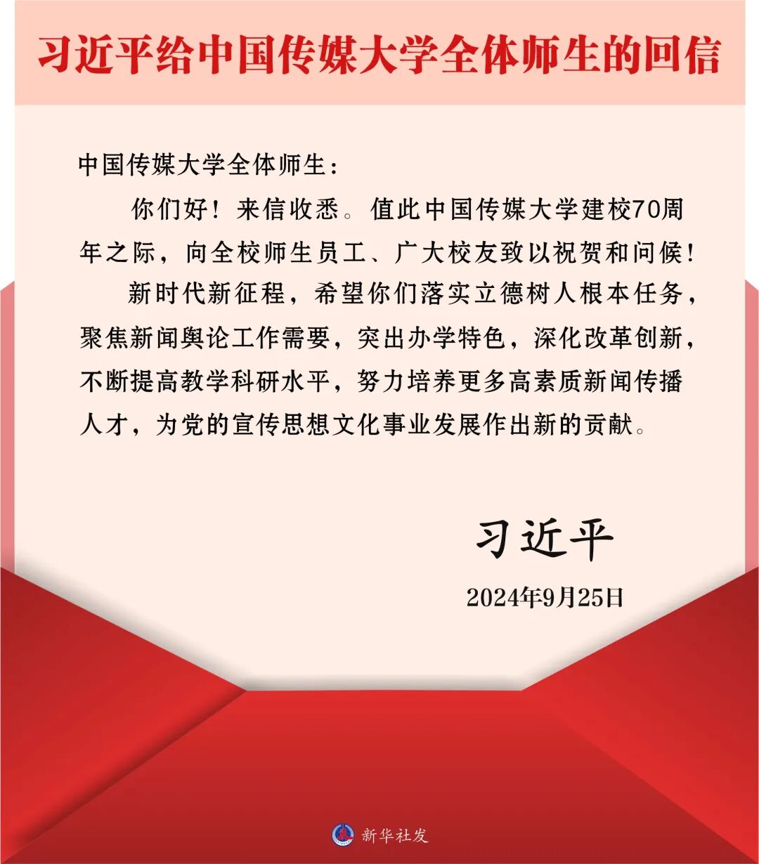9月25日,中共中央总书记、国家主席、中央军委主席习近平给中国传媒大学全体师生回信,在中国传媒大学建校70周年之际,向全体师生员工、广大校友致以祝贺和问候。习近平在回信中强调,新时代新征程,希望学校落实立德树人根本任务,聚焦新闻舆论工作需要,突出办学特色,深化改革创新,不断提高教学科研水平,努力培养更多高素质新闻传播人才,为党的宣传思想文化事业发展作出新的贡献。