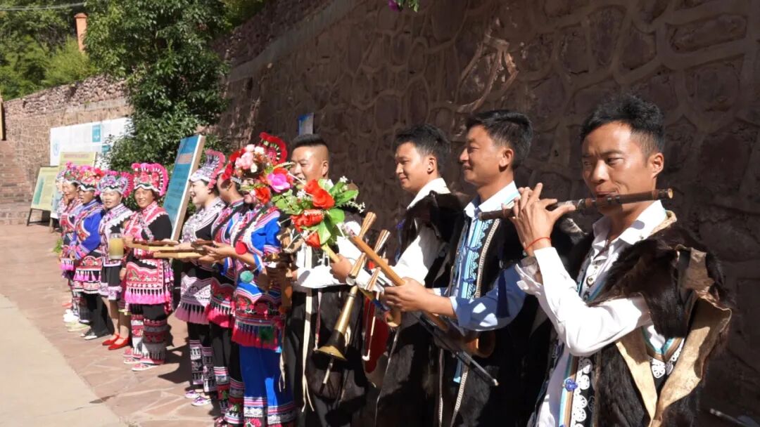 来到外普拉,迎宾队伍有的吹着长号,有的唱着彝族迎宾调、跳着彝族左脚舞,一碗“拦门酒”表达了彝家儿女对游客的热情和欢迎。