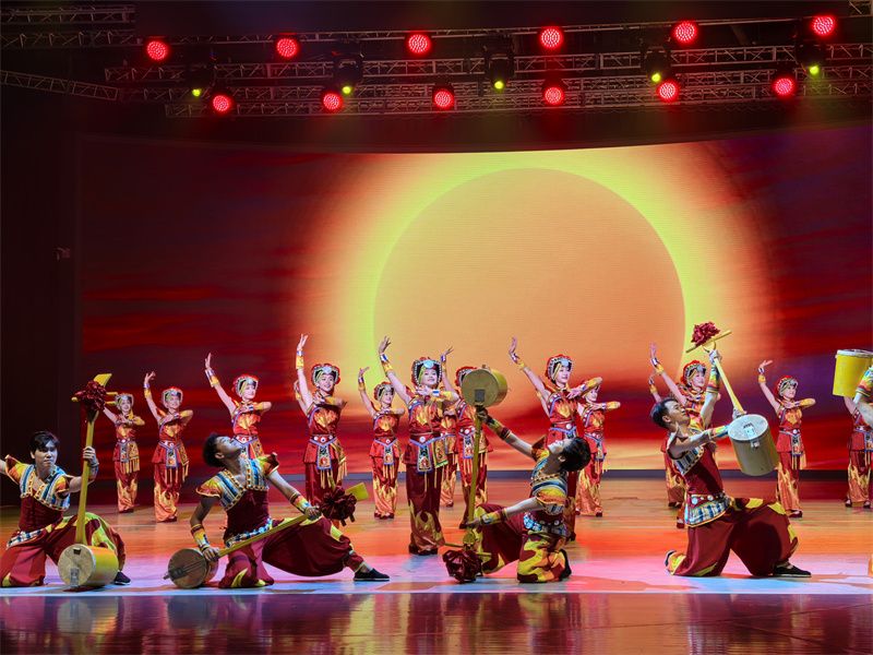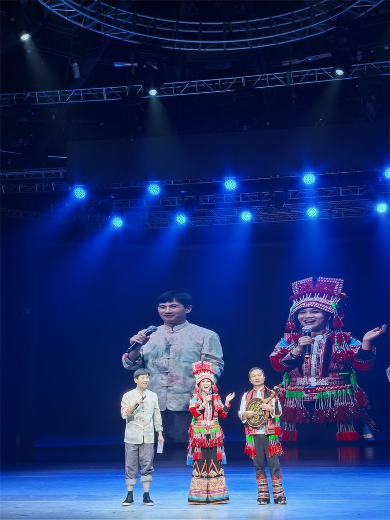 演出前,欢快的彝族阿细跳月在剧院前上演,演员们与前来观看演出的小朋友们手拉着手,跳起《阿细跳月》,沉浸大三弦弹奏的轻快节奏中,也感受到了红河州彝族人的热情好客,度过了一段欢乐时光。