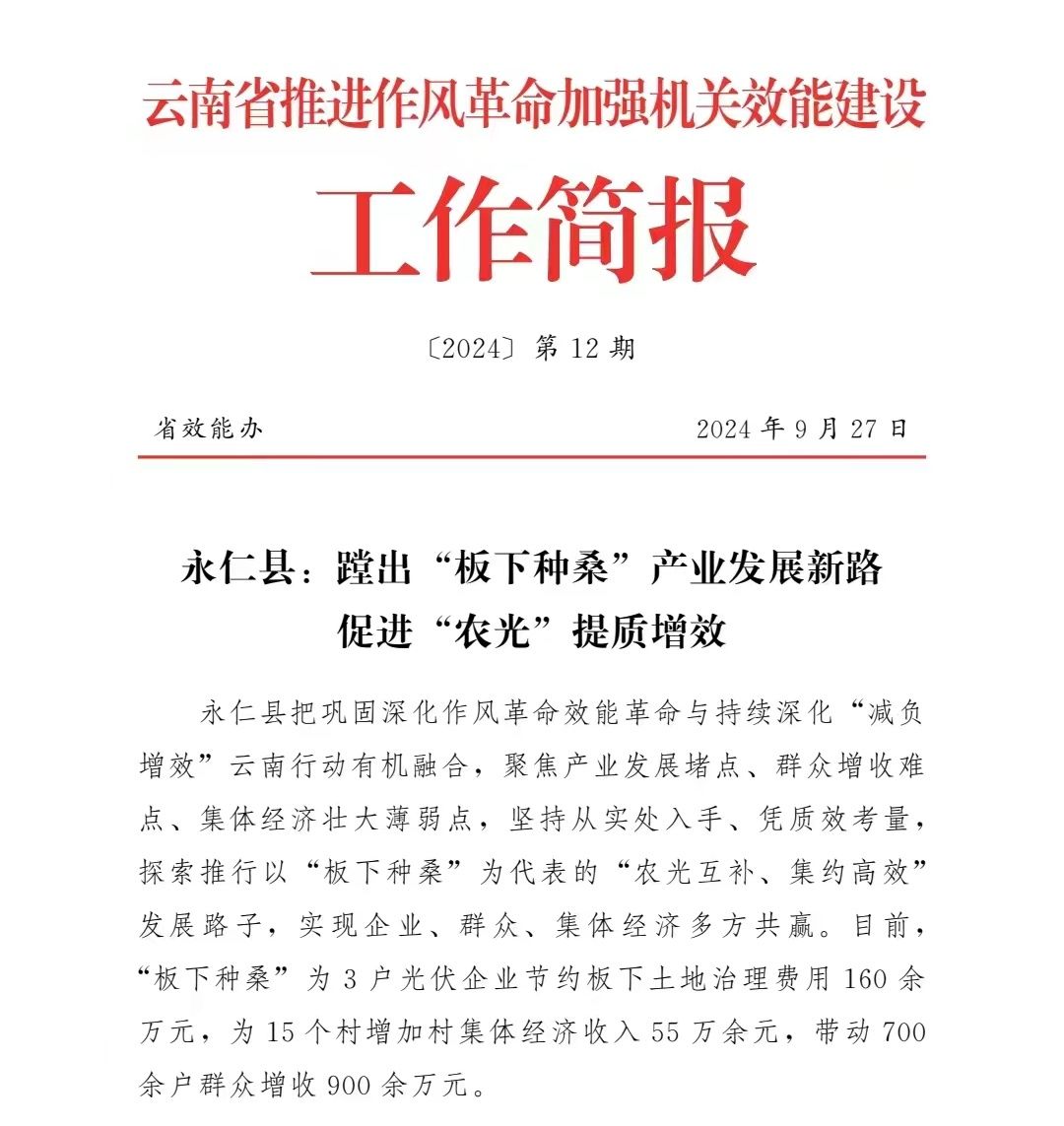 2024年9月27日,云南省推进作风革命加强机关效能建设工作简报〔2024〕第12期宣推典型事例“永仁县:蹚出‘板下种桑’产业发展新路 促进‘农光’提质增效”。此前“永仁县:企业家说来这里投资是这辈子最正确的选择”获选2022年云南省第一批作风革命效能革命典型事例,“永仁县:搭建‘幸福里’劳务用工平台 打造企业招工与群众就业‘直通车’”获选2023年云南省作风革命效能革命第六批先进典型。