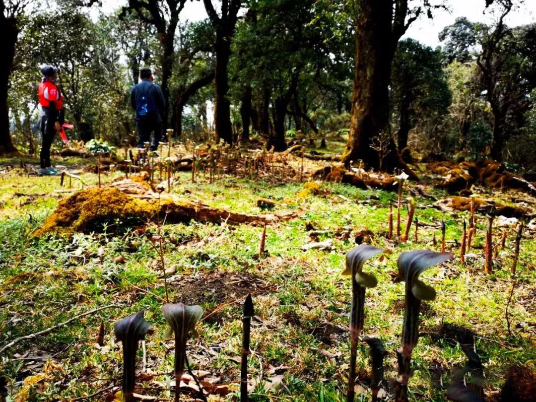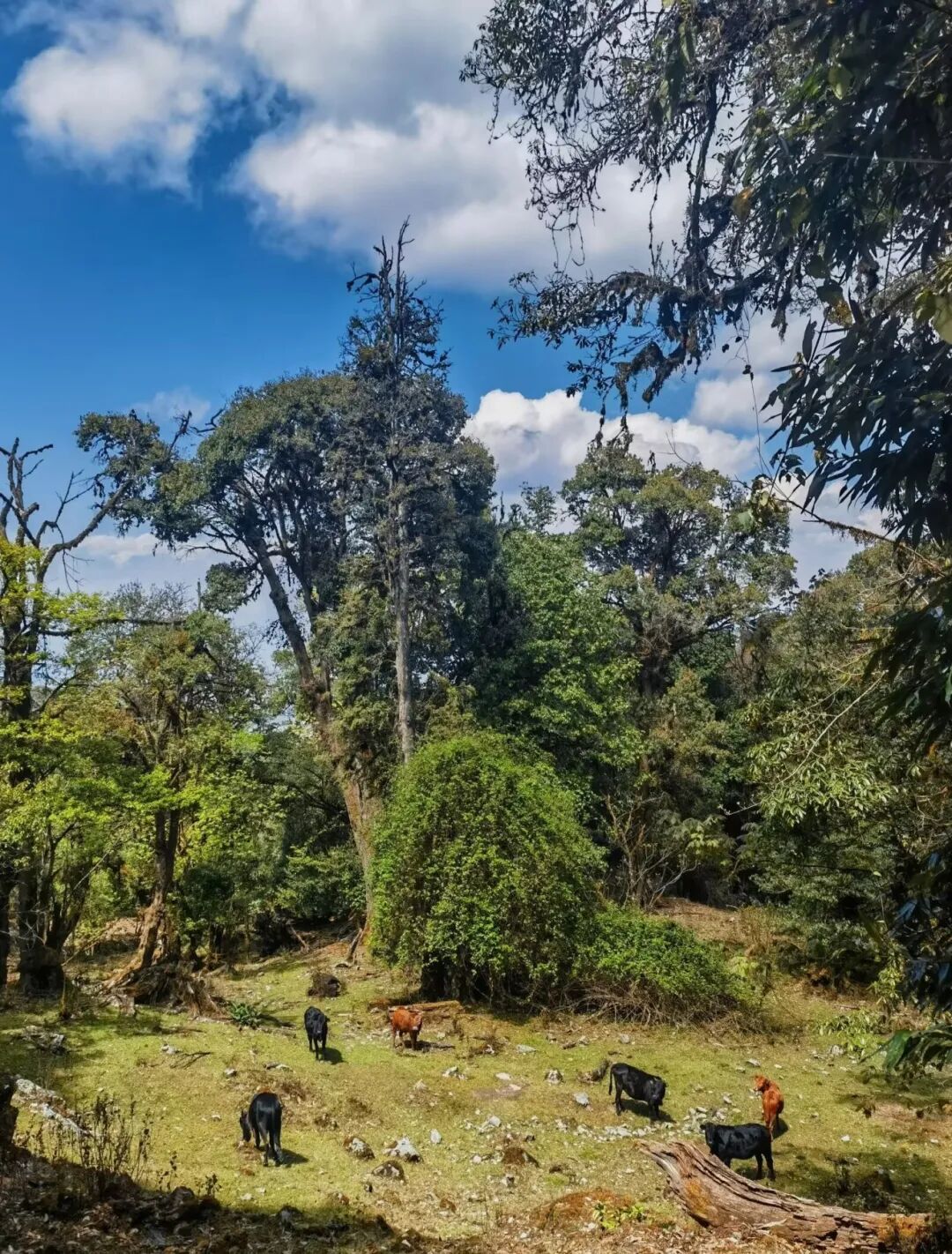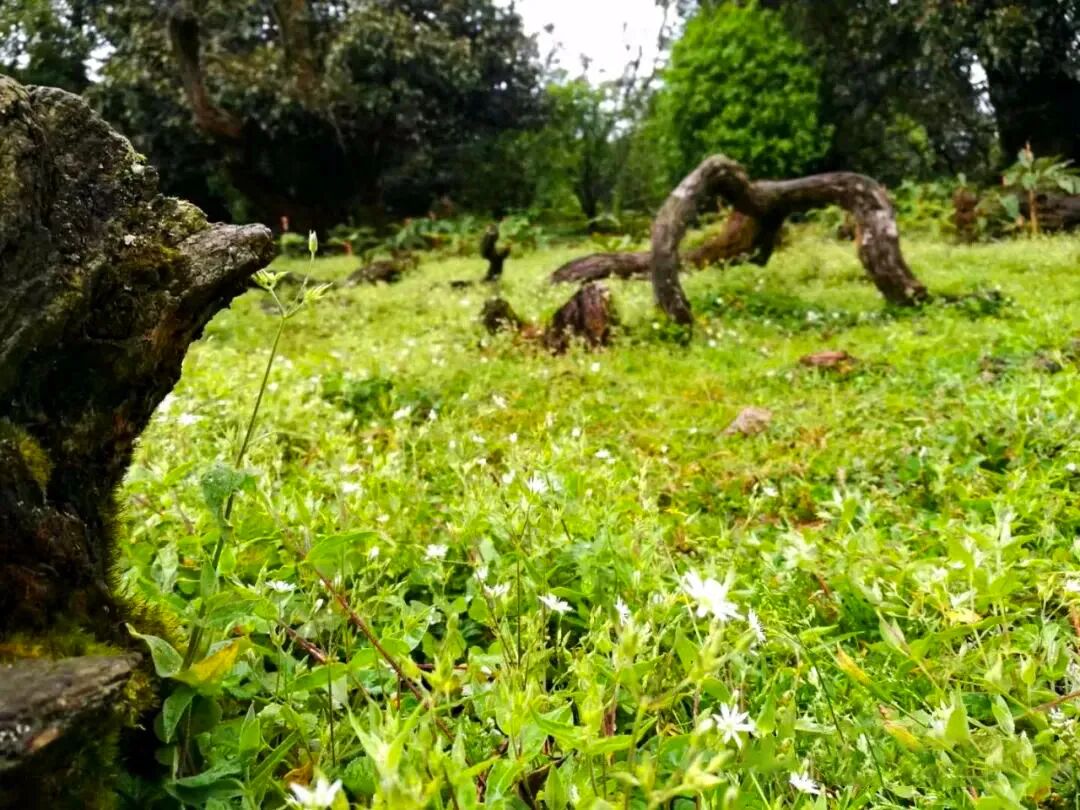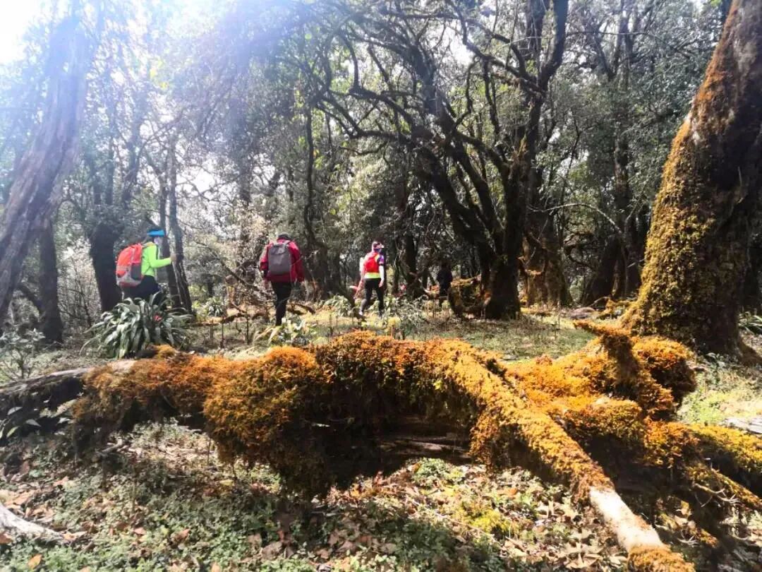 随着海拔的上升气温也有所下降,坡度也大幅减缓,渐渐进入丛林覆荫率增高,徒步体验感从艰辛过渡到了舒服。约3.5公里处钻出密林,眼前是一片丛林怀抱的草原,避风、向阳且开阔,草地中央有一株不知道已经矗立了多少年高大苍老的古树,周边层林叠翠,一个天然绿色的氧吧。春天白瑞香的香味弥漫,夏天是个柔软的绿毯子,是中途休息、野餐的不二之选。