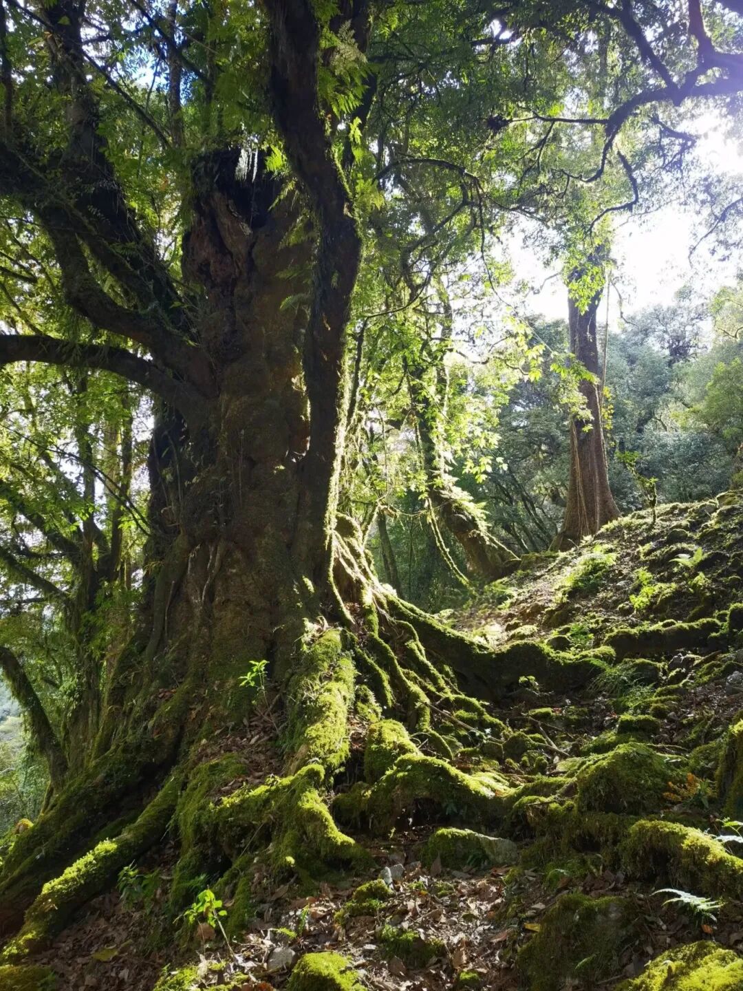几十米的参天古树遮天蔽日,宛如上古神灵,树与树之间有很多藤蔓蜿蜒攀缘,树缝里挤进的阳光出现了丁达尔效应,照出苔藓青翠可人的模样。