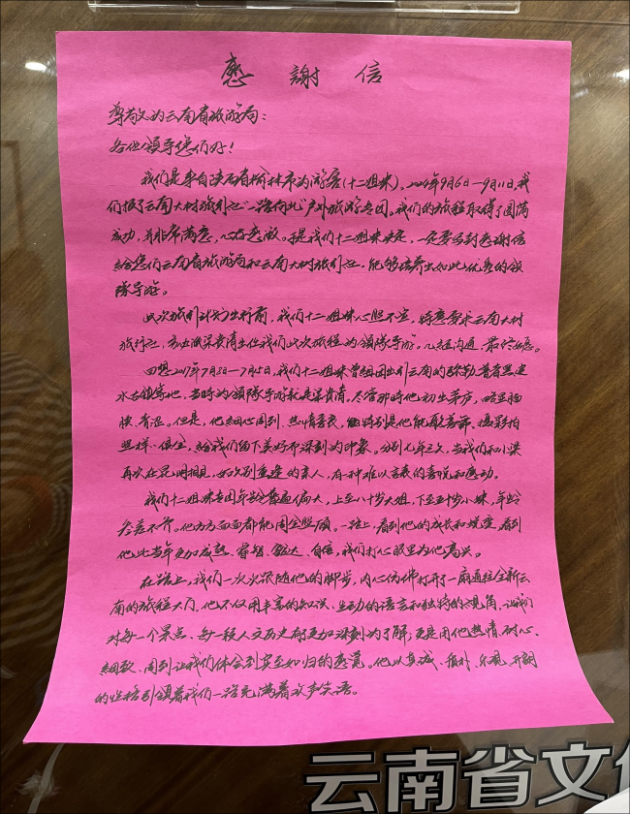 “云南,我们还会再来!小梁,我们还会再见!”近日,云南省文化和旅游厅收到来自陕西省榆林市“十二姐妹”寄来的感谢信。信中提到,梁贵清作为“十二姐妹”两次云南之旅的领队导游,旅途中凭借热情体贴、细心周到的服务,能歌善舞、会拍会剪的技能,让“十二姐妹”的云南之旅变得更加多姿多彩。