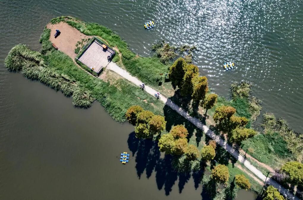 市民和游客在由滇池绿道串联的干沟尾湿地公园游览(无人机照片)。新华社记者陈欣波 摄