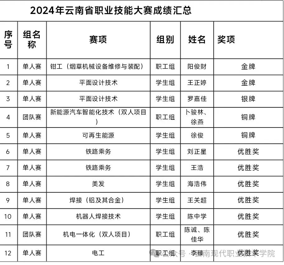 2024年云南省职业技能大赛,楚雄技师学院(云南现代职业技术学院)又获佳绩,2人获得金牌、1人获得银牌、2人获得铜牌、7人获得优胜奖,详情如下: