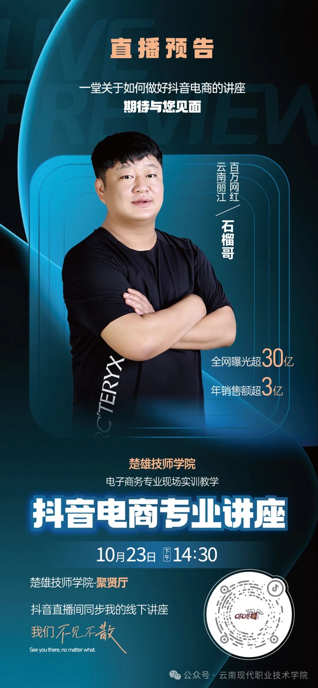 【直播预告】丽江“石榴哥”到楚雄技师学院讲抖音电商并直播,快来围观! 2024-10-22 11:05 0 直播预告!10月23日14:30,云南丽江百万网红石榴哥在楚雄技师学院聚贤厅讲授一堂关于如何做好抖音电商的讲座,期待与您见面!抖音直播间同步线下讲座,我们不见不散! 来源 楚雄技师学院 责编 张永强 校对 汤雁玲 审核 古文丽