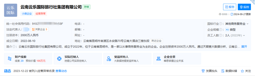 记者通过软件搜索发现,名单中提到的云南云乐国际旅行社集团有限公司成立于2022年,目前为存续状态,但经营异常。公司位于官渡区永安路70号,云南大酒店三楼东段。