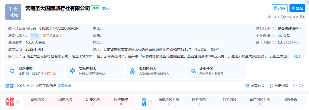 随后,记者又对《公告》上的云南圣大国际旅行社有限公司进行了搜索,该公司成立于2022年,目前为存续状态。公司位于官渡区百富琪商业广场A2座1215号。记者根据该地址也找到了该公司,公司虽然有人员值班,但其表示,对公司被拟吊销业务经营许可证一事并不知晓。