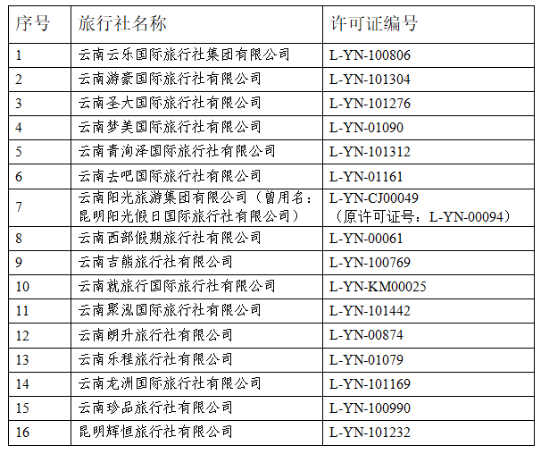 云南云乐国际旅行社集团有限公司等16家旅行社(名单附后):