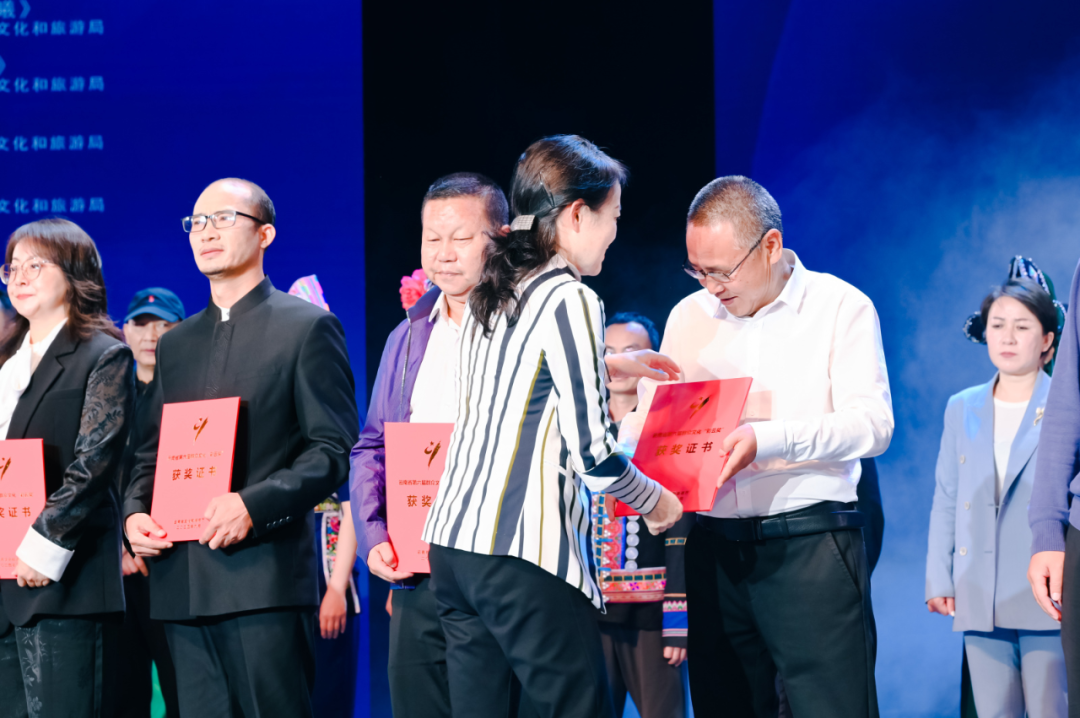 日前,昆明市春城剧院灯光璀璨、气氛热烈,伴随着嘹亮的歌声、优美的舞姿,云南省第六届群众文化“彩云奖”获奖节目(作品)集中展演展示暨颁奖晚会热烈举行。云南省文化和旅游厅党组书记、厅长赵国良,厅党组成员、副厅长王江红等领导出席晚会并颁奖。由全省16个州(市)文化和旅游局、文化(群艺)馆选送的17个获奖节目轮番登台展演,为观众献上了一场精彩的视听盛宴。临沧市选送的舞蹈《幸福花开》在晚会上大放异彩,获得掌声不断。