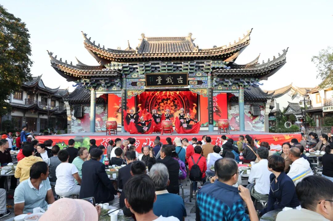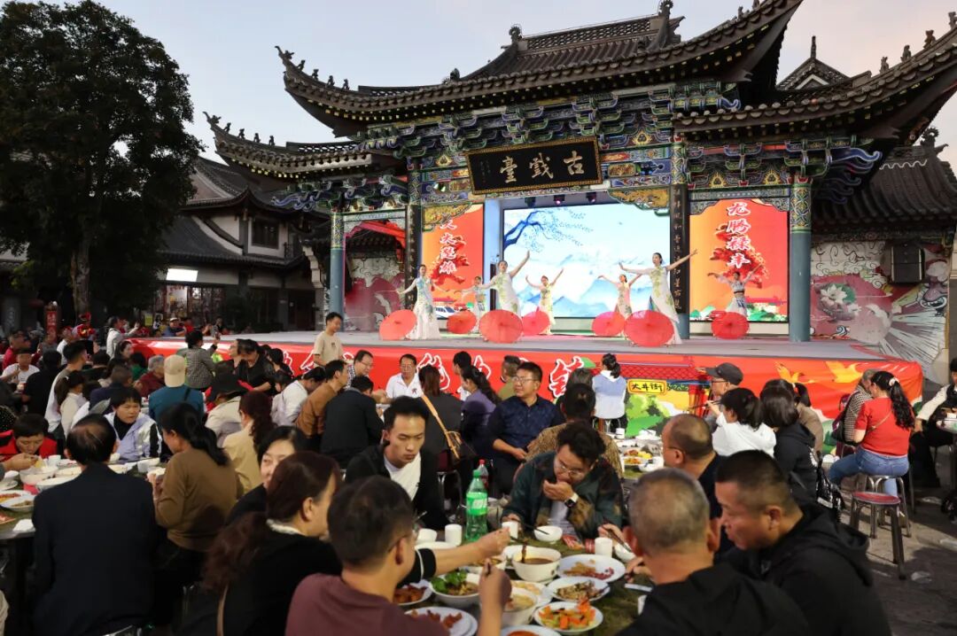 除了味蕾刺激,还有视听盛宴。金山古镇古戏台前宴席上欢声笑语、气氛热闹;戏台上热情好客的彝家欢迎曲、优美飘逸的古风舞、欢快灵动的彝族舞等轮番上演,节目丰富多彩、精彩纷呈,这种组织形式让人们既能享受美食,又能感受独特的文化氛围。