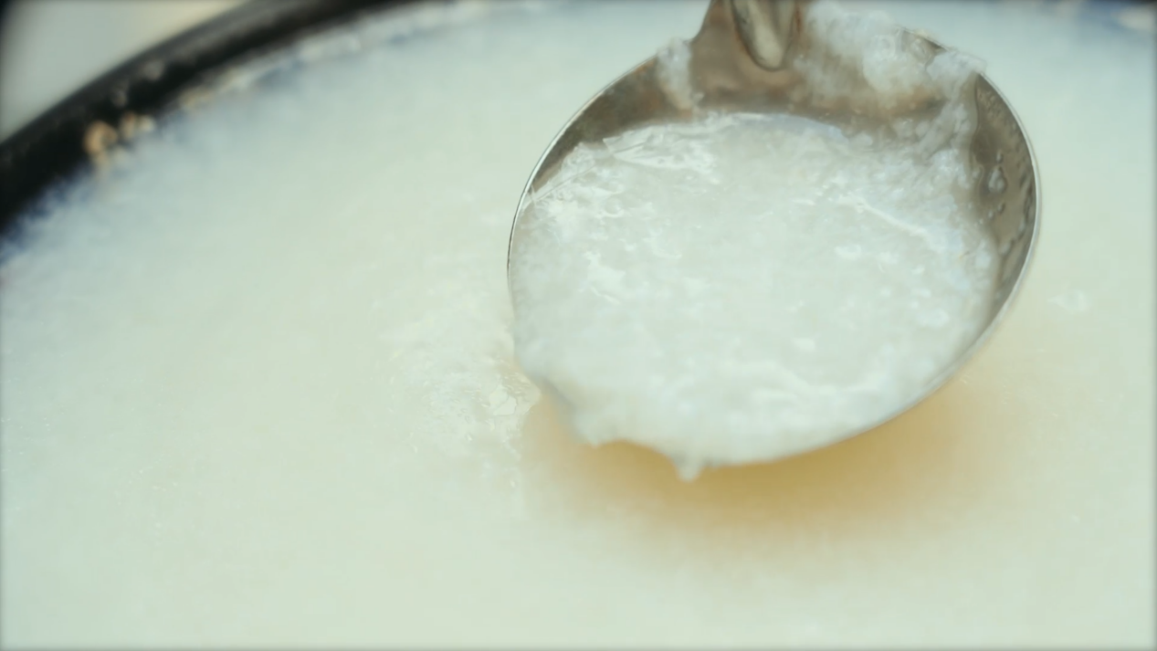 藕粥,不是煮好一大锅,来客舀一碗。是现点现擦现做,用已擦了几十年的瓦擦将藕磨碎成泥,放少许盐搅拌。在瓦或陶锅中放入用大骨和鸡肉熬成的高汤,汤初沸时加入藕泥不停搅拌,几分钟后即得一碗泛着温润光泽的藕粥。擦断的丝缕用另一种方式溶入、黏合,将炙热、将美好沉淀,不言不语,不动声色。