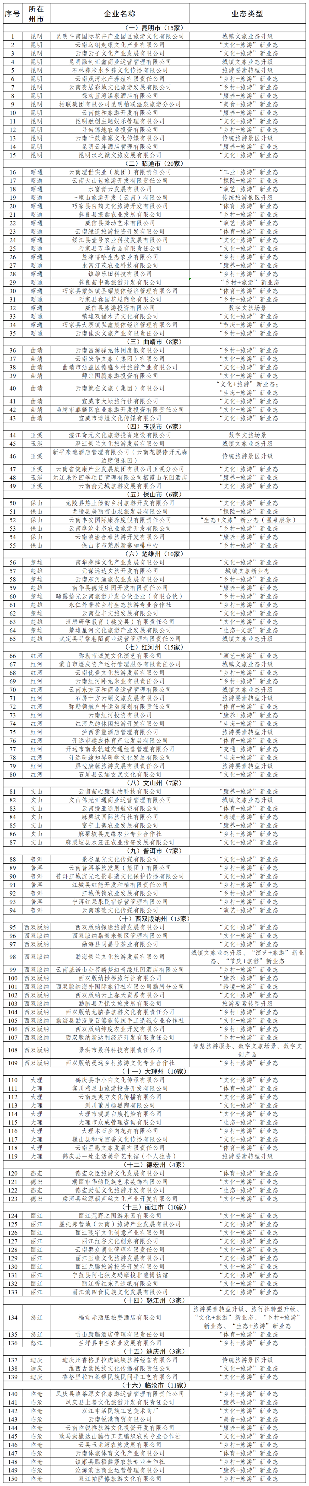 为贯彻落实《云南省人民政府关于进一步优化营商环境促进市场主体倍增的意见》(云政发〔2021〕21号),根据《云南省促进市场主体倍增领导小组关于印发促进文化和旅游市场主体倍增培育计划》(云促主体倍增小组发〔2021〕1号)的通知精神,云南省文化和旅游厅组织开展了2024年云南省文化和旅游新业态企业认定工作。通过企业自愿申报、州市评分推荐、省级专家评审,现将昆明斗南国际花卉产业园区旅游文化有限公司等150家云南省文化和旅游新业态企业拟认定名单予以公示。公示时间为2024年10月30日起5个工作日。