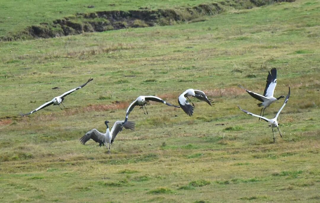 黑颈鹤翩翩起舞于蓝天碧水之上