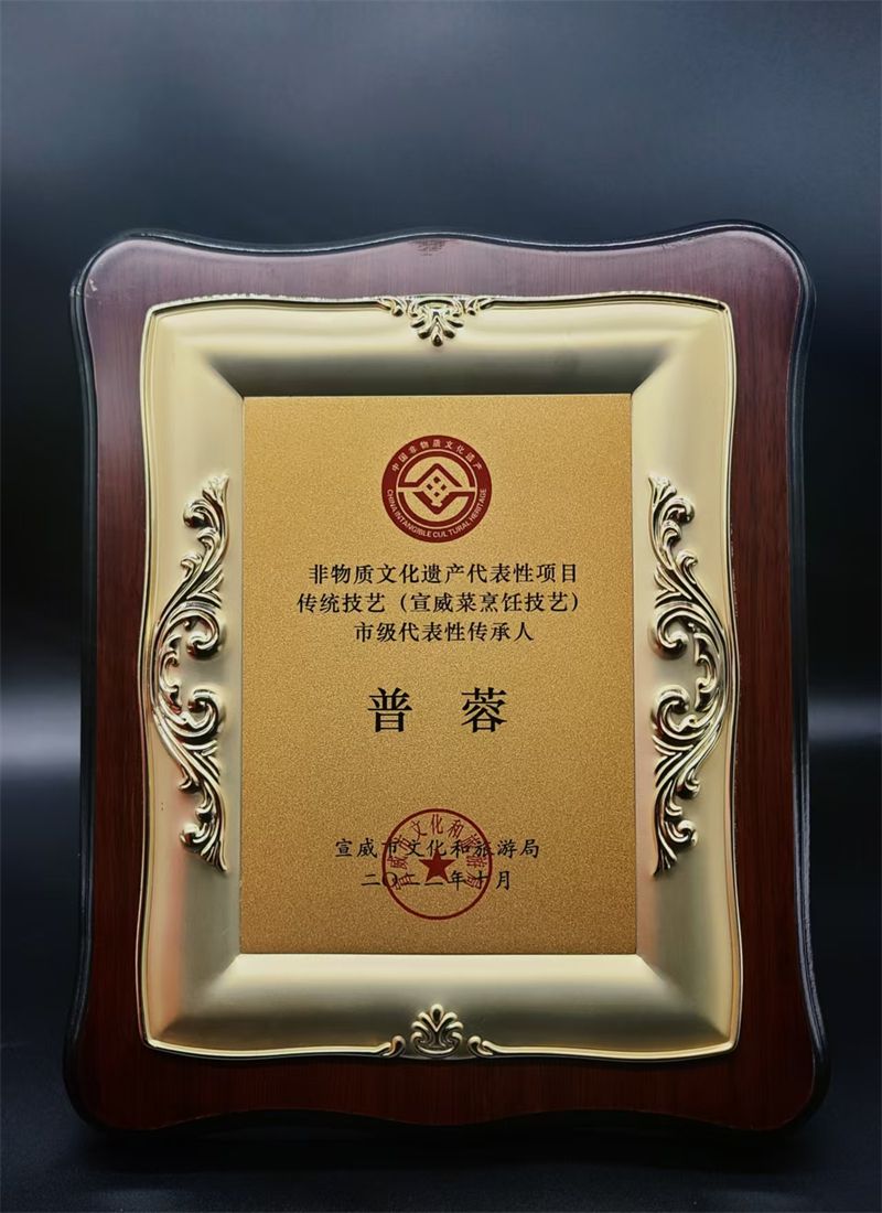时至今日,土八碗依然是宣威乡间的待客隆仪,这道美味充满了宣威地方口味与民俗文化,深受周边群众的喜爱和推崇。作为宣威菜烹饪技艺传承人的普蓉,自小就跟随厨艺精湛的外祖母和从事餐饮业多年的母亲学习,将独具宣威文化价值的宣威菜制作特点、方式、技艺原汁原味地传承和保留了下来。其所任职的宣威交通大酒店制作销售土八碗已有几十年的时间,注册品牌为“宣驿土八碗”,是宣威第一家开发宣威土八碗礼盒系列产品的大酒店,有效推进了土八碗的品牌化发展,产品畅销全国。酒店多年来精益求精,保证原料取材绿色新鲜,生产过程干净卫生。所有菜品无添加剂、防腐剂,都是真正的绿色食品。2022年,宣威交通大酒店土八碗制作技艺认定为省级非物质文化遗产;2024年,认定为中国非物质文化遗产宣威菜烹饪技艺市级非遗工坊。