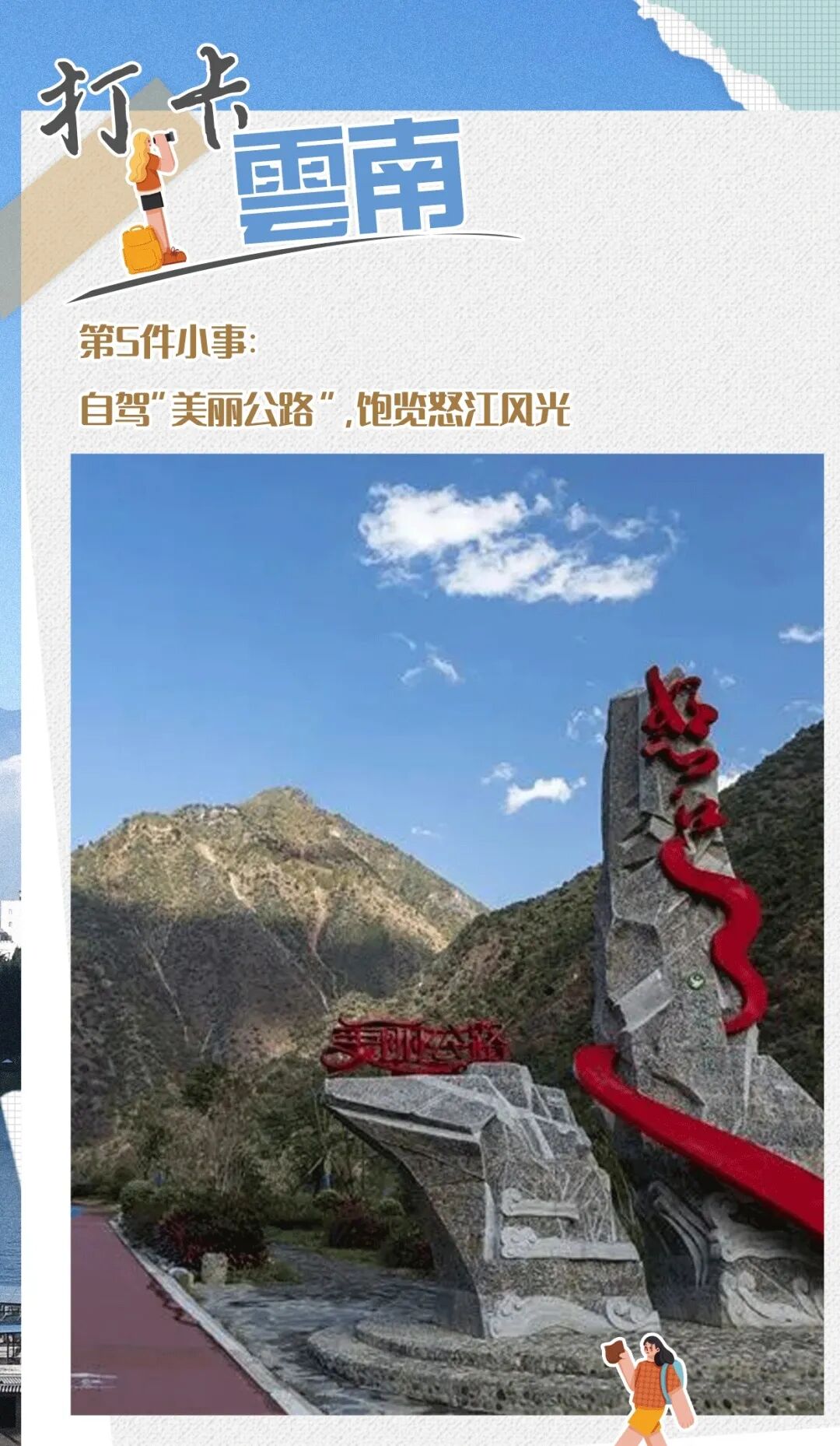 怒江“美丽公路”于2019年12月建成通车,曾经险象环生的沿江公路摇身一变,成为新的“网红打卡点”。怒江“美丽公路”起于怒江州泸水市六库镇,止于贡山县丙中洛镇,蜿蜒盘亘于怒江大峡谷之中,全长288.3公里,沿途风光旖旎,碧罗雪山、石月亮、飞来石、江中松、老虎跳以及奔腾不息的怒江水,组成一幅波澜壮阔的山水画卷。