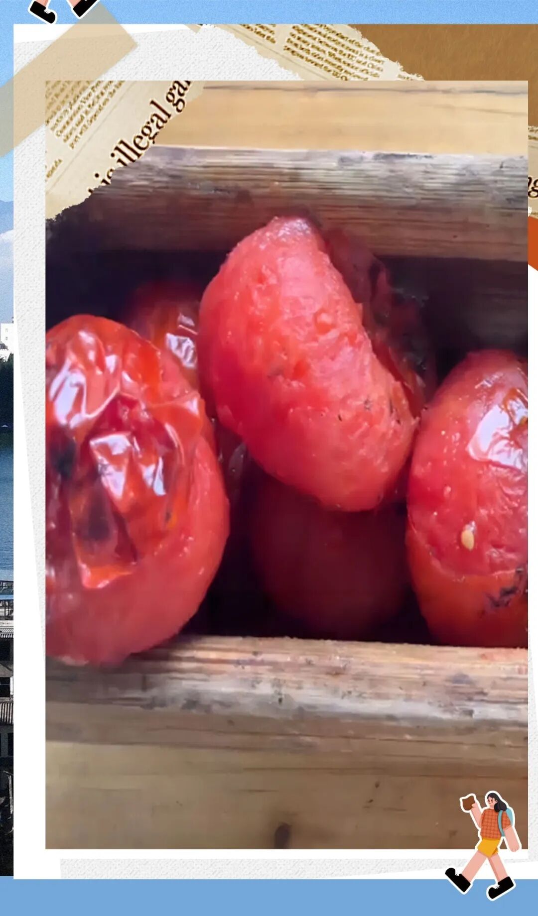制作一份鲜香美味的番茄“辣咪”,需先将洗好的番茄放到火炭上烤至松软,并顺手煨热些小米辣、大蒜等佐料。