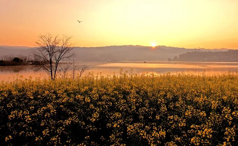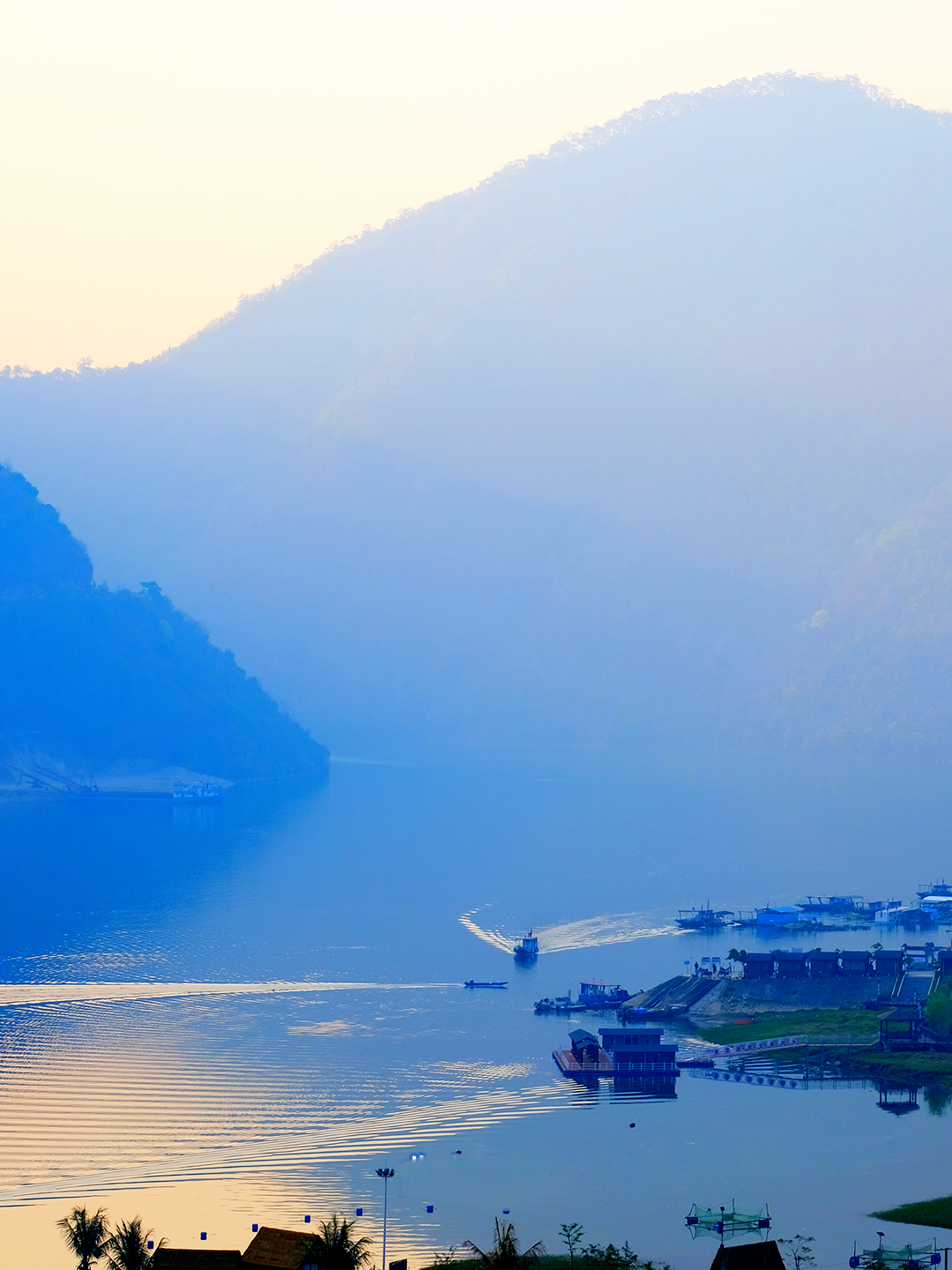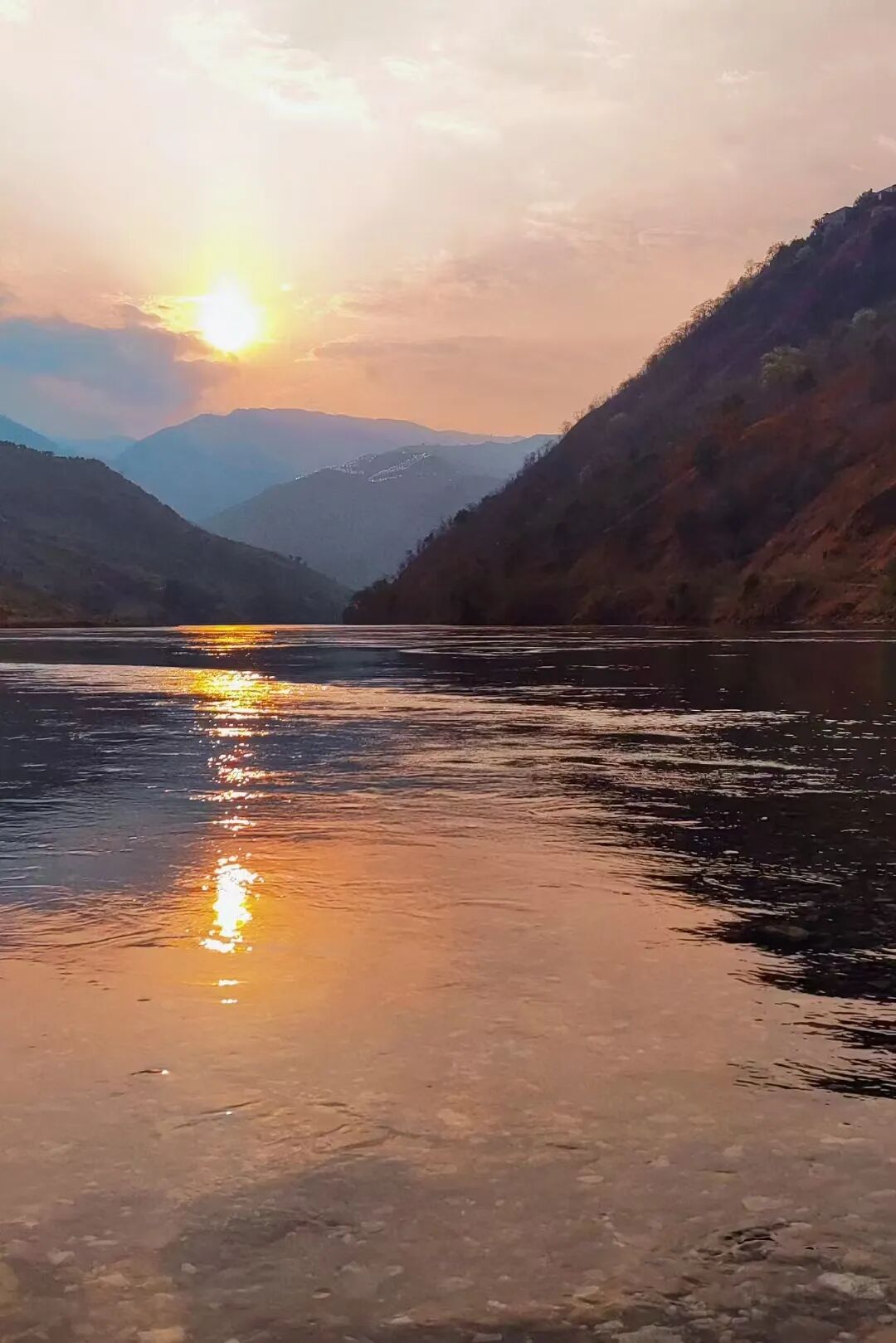 水天间的日落绮梦曼莱湖四面环山蓝天白云,湖光山色是一幅浓淡相宜风景别致的山水画在这里观赏日落你将体验到水天相接处那份独有的静谧与梦幻当夕阳的金色光芒穿透薄云轻轻洒在波光粼粼的湖面上整个世界都被染上了一层温柔的金辉既宁静又壮阔。