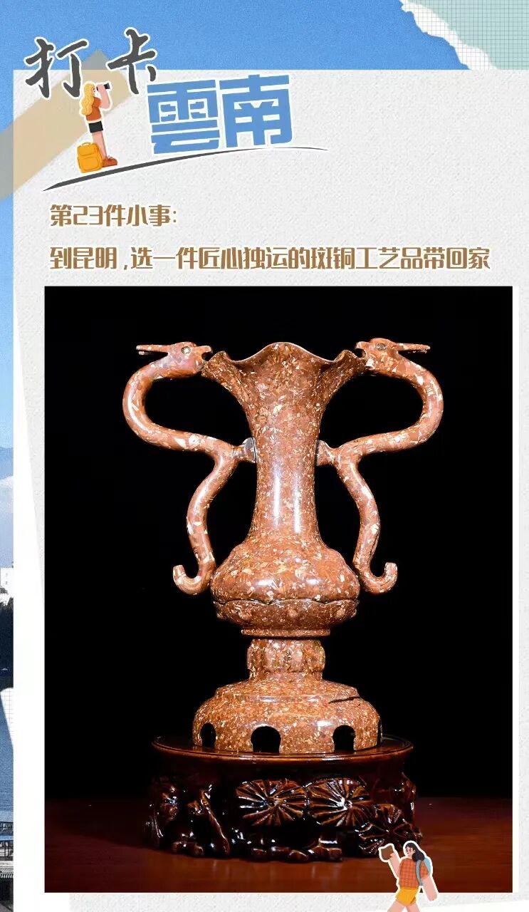 昆明斑铜工艺品以其精美的造型、精湛的技艺、优美的神韵使人迷醉,每一件都独具匠心、精美绝伦,来昆明旅游,不要忘记选一件称心如意的带走哟!