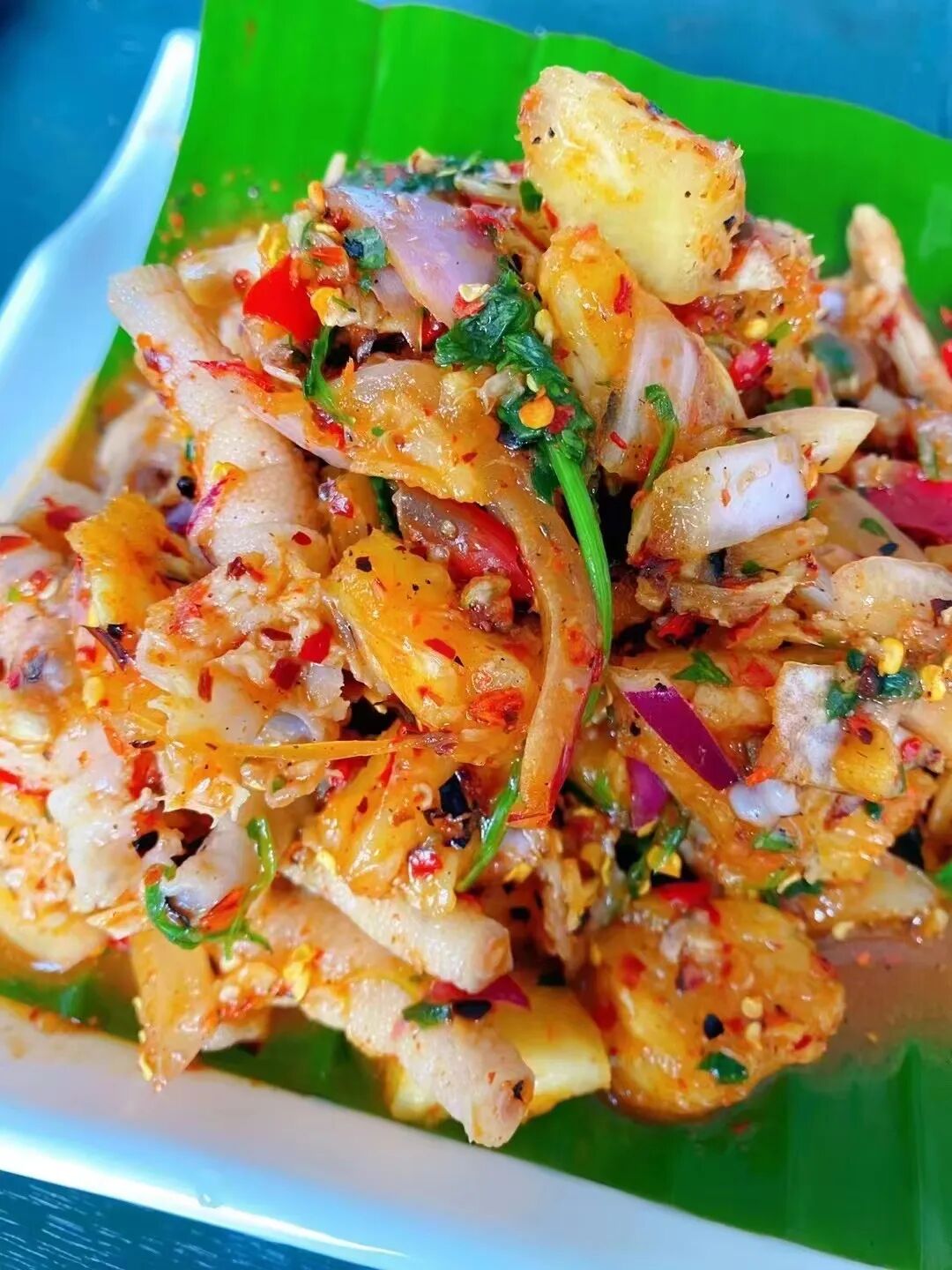 红生是佤族的传统美食,以火烤猪皮、猪头肉搭配生猪血,佐以各种香料制成。这道菜风味独特,是临沧火辣辣美食中的一道独特风景。