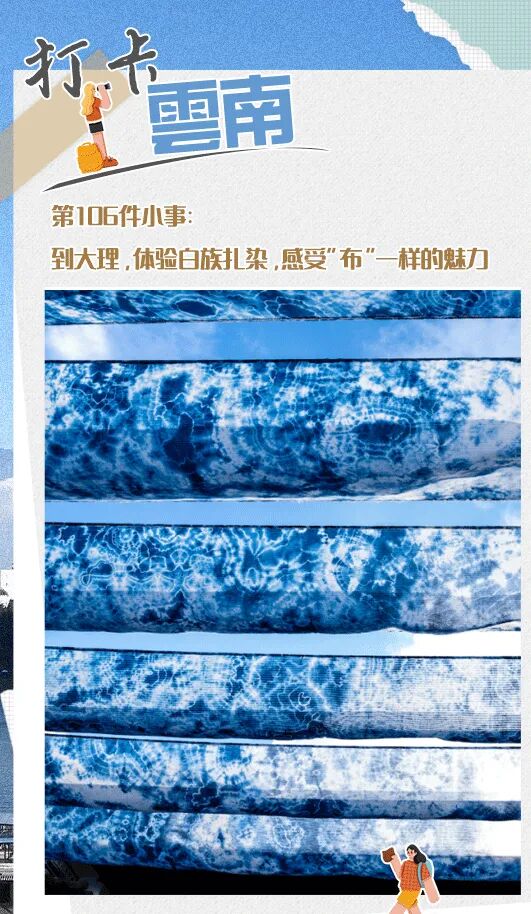 “巧手扎锦绣,靛蓝染春秋”,扎染是白族的名片,亦是游客去大理白族自治州热衷打卡的项目。蓝白之间印染出千百年来积淀的白族文化和大理的民情风俗。
