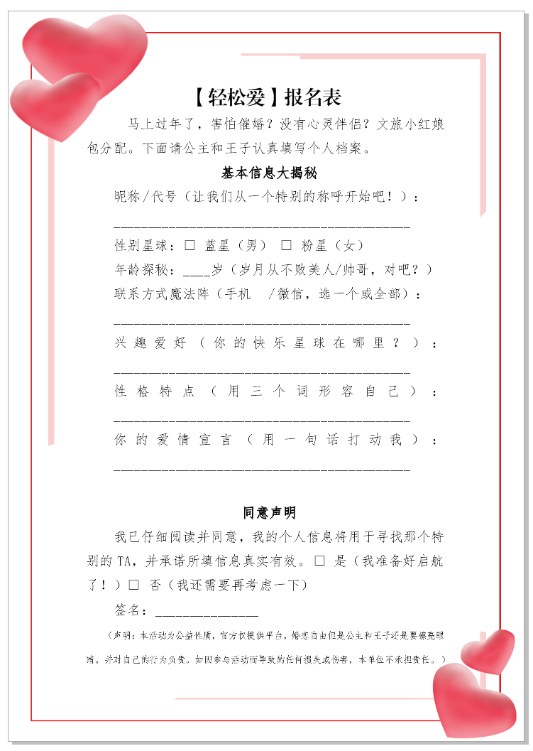 前来参加活动的追爱人需要带上个人照片填写一份“轻松爱”报名表,即可领取临沧文旅明信片一份。填写好的报名表会贴在“爱的表白墙”上,可以让来参加的人互相留下心仪对象的联系方式。