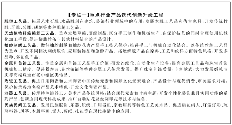 (三)促进产品创新升级。提升行业工业设计能力,结合现代生产生活方式,加快工艺美术设计观念、艺术风格、实用价值的创新转化,促进工艺美术产品在现代生活中广泛应用。将具有民族特色的工艺特点、文化寓意、图案形式、造型结构等元素融入产品生产创作,提高产品文化和艺术价值。探索开展工艺美术行业融合创新试点工作,丰富题材和产品品种,促进工艺美术行业与文旅文创、品牌授权、数字赋能、科技创新、乡村振兴等融合发展。结合国潮、国漫、国风、国粹,开发一批创新创意产品,促进产品迭代升级。