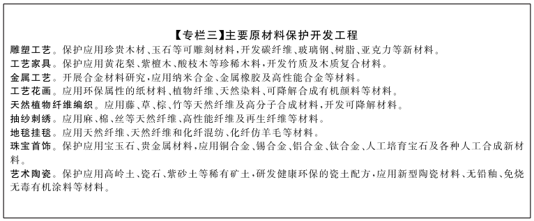 (五)加强原材料保护开发利用。深入挖掘各地特色优秀工艺美术资源。对涉及天然稀缺原材料的工艺美术门类,加强原料保护开发和综合利用。重点支持传承情况好、市场空间大、应用场景多的工艺美术项目,在不影响核心技艺保护传承的情况下,研发生产成本低、来源便利、生态环保的替代材料,强化原材料供应保障能力。