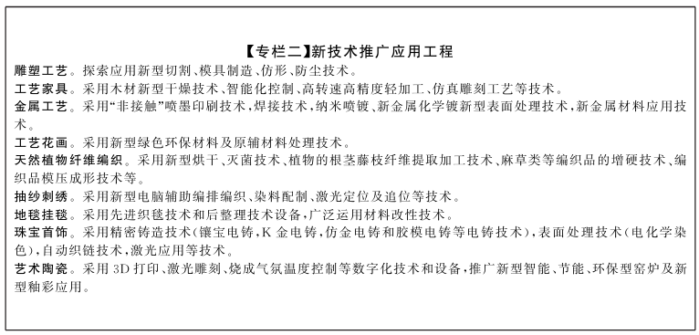 (四)加强工艺设备升级。支持建立一批传承创新发展平台,加强对工艺美术传统技艺的挖掘整理、系统记录和科学研究。支持企业加大对传统产品制作技艺的发掘与传承,在保持传统配方、工序和核心技艺的基础上,探索计算机辅助设计等专用系统与装备的研究应用,通过设备改造、工艺改良、关键技术突破等,助力工艺创新。加强节能设备和技术推广应用,实现减污降碳、绿色节能发展。