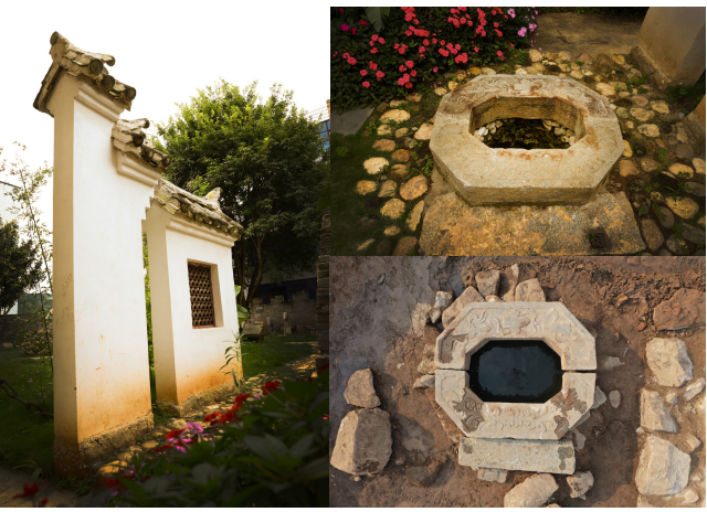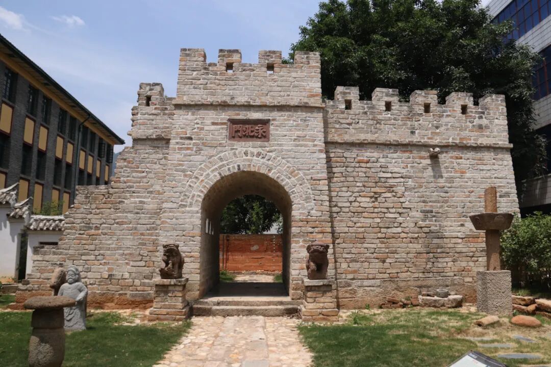 后院最醒目的莫过于缅宁古城城墙的残垣——缅宁古城永北门。缅宁古城遗址位于临沧市临翔区,清乾隆三十三年(公元1768年)在原土城基础上改建为砖城。古城修建有四座城门,其中永北门为古城北门,红砂岩质石刻门牌在早年文物调查中发现。通过查阅历史文献,按照现有史料记载,对调堪中发现的残段墙基及青砖按原结构、原材料方式进行场景再现。