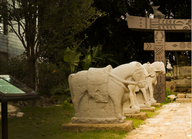 室外展区中轴线茶马古道也是一个亮点。茶马古道鲁史段是现临沧境内保存较好的一处古驿道,开辟于元成宗大德六年(1302),距今已近七百多年的历史,茶马古道以马帮为主要交通工具的民间国际商贸通道,是中国西南民族经济文化交流的走廊。室外展区沿东西轴线分布的一条石板小路,真实写照了现存茶马古道的外在特征,小路两侧站立的石马,正是那个时代穿梭在古道上连绵不绝驮运队伍的缩影。