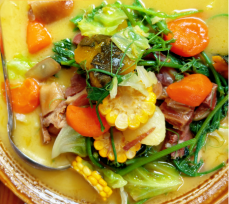 火腿杂菜中的火腿是关键,通常选用经过一年或更长时间低盐发酵的临沧土猪火腿。再加入各类绿叶蔬菜,如豌豆尖、茴香、玉米、人工菌、白菜、瓜尖、金针菇、胡萝卜、南瓜、洋芋等。这些蔬菜在火腿汤的烹煮下,更加鲜美可口。一碗热腾腾的火腿杂菜在冬日能带给人温暖和满足。