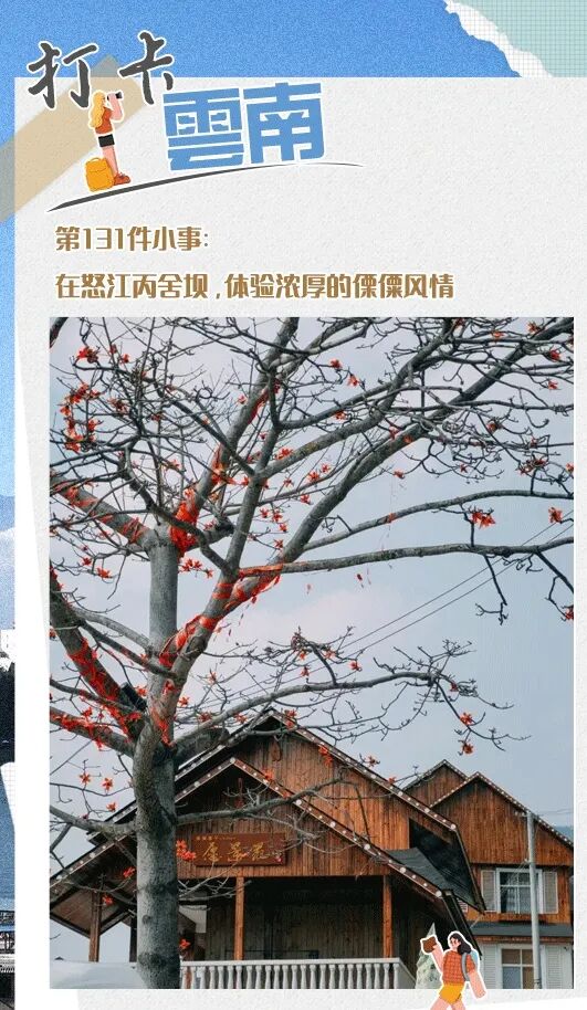 沿着云端栈道散步,观赏怒江花谷漫山遍野的叶子花,红的、紫的、白的、粉的……穿过219.9米寓意“爱你长长久久”的玫瑰廊道,到寨子里穿上傈僳族服饰,体验传统织布、泥塑。在帐篷营地露天烧烤、感受农耕文化。还可以舂粑粑、酿杵酒,体验亲手制作美食的趣味,围着火塘品尝自酿酒“布汁”和鸡肉煮制的峡拉,欢唱傈僳民歌。