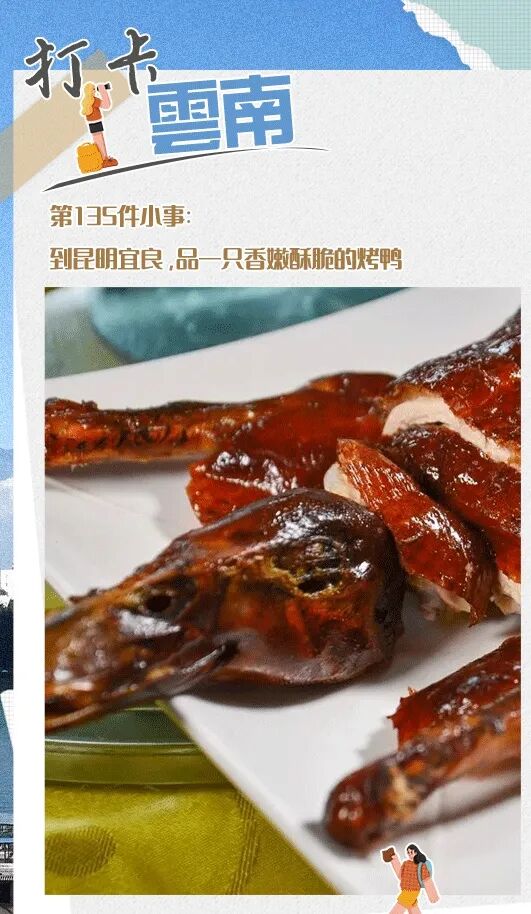 宜良烤鸭,是昆明宜良的代表美食之一,也是云南经典的地方传统名肴之一。其原料选用当地特有的小麻鸭,烤好后色泽红艳、肉质香嫩、肥瘦相宜,深受当地人的喜爱。