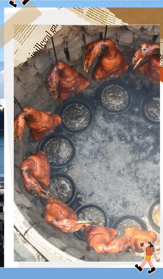 烘烤时,以松毛结为燃料,待其燃到烟尽,适时翻转鸭身,涂抹蜂蜜水、猪油于表皮。为避免鸭油入火,燃烧冒黑烟污染鸭子,一般还要在鸭体离松毛炭火约30厘米处放一个接油盘。这样烤出的鸭子,脆而不焦,肉酥离骨,色鲜味美,香气四溢。为一道美食赴一座城,如今的宜良烤鸭吸引着五湖四海的食客到宜良来,品尝这道香嫩酥脆的美食,感受地道“宜良味”。