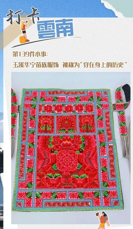 玉溪市华宁县苗族服饰世代相传,被赋予了继承民族传统、纪念祖先和传承祖训的内涵和意义,因而被誉为“无字史书”。从服饰表现内容上看,服饰图案大多取材于日常生活中的各种物象,有表意和识别族类、支系的重要作用,这些形象的记录被专家学者称为“穿在身上的历史”。2017年6月,华宁县苗族服饰被列入云南省第四批省级非物质文化遗产代表性项目名录。