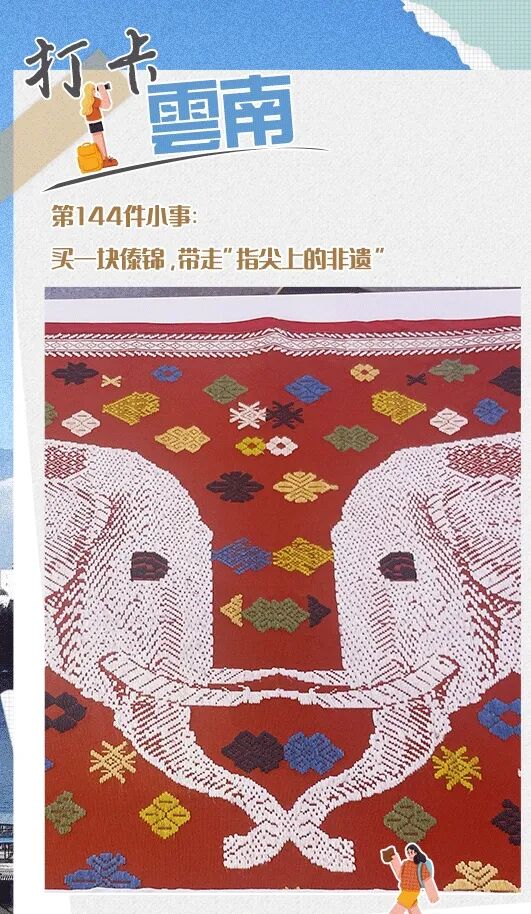 傣锦美观大方的样式,极具浓郁的民族风格,随着人们生活习惯的变迁,也在社会发展过程中不断传承、创新,现在的傣锦也被做成各式各样的文创产品,这份指尖上的非遗伴手礼,简约典雅、色彩素净,深受游客们的喜爱。