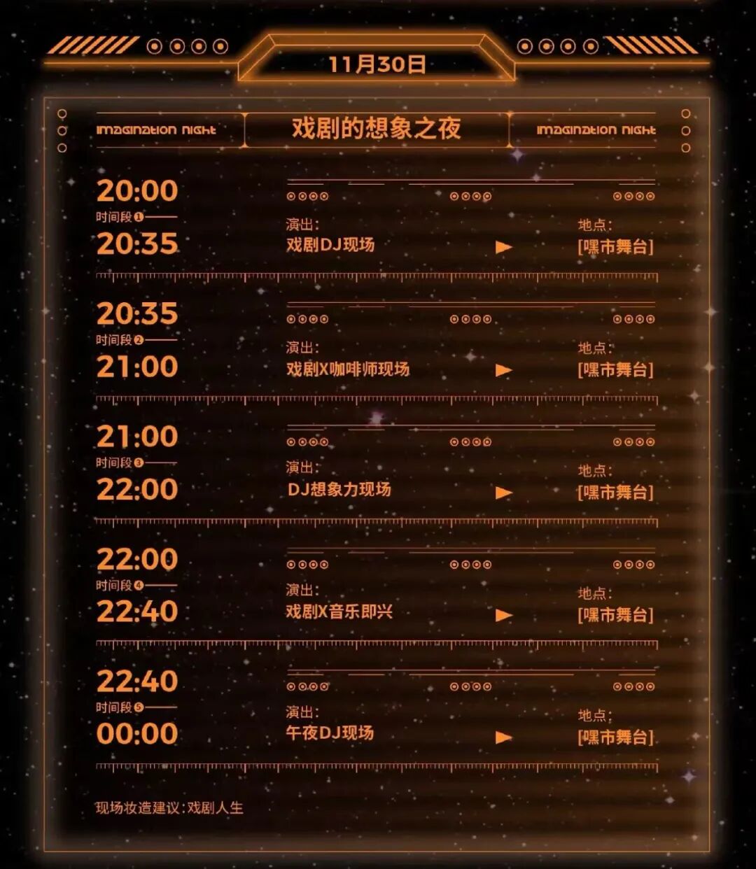 戏剧的想象之夜:时间,11月29日-11月30日 19:30-24:00。DressCode:戏剧人生