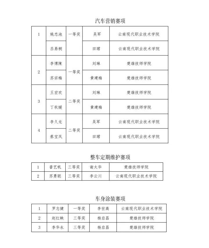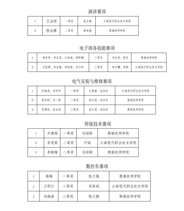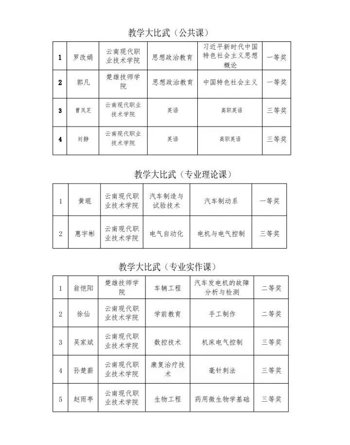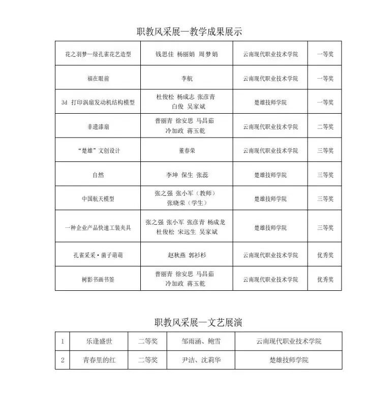 楚雄技师学院 云南现代职业技术学院选派71名选手参加2024年楚雄州职业教育技能大赛,选派17名教师参加教师课堂教学大比武,15人荣获一等奖,18人荣获二等奖,25人荣获三等奖;职教风采成果展示3个作品荣获一等奖,1个作品荣获二等奖,4个作品荣获三等奖,2个作品获优秀奖;文艺节目展演荣获2个二等奖。