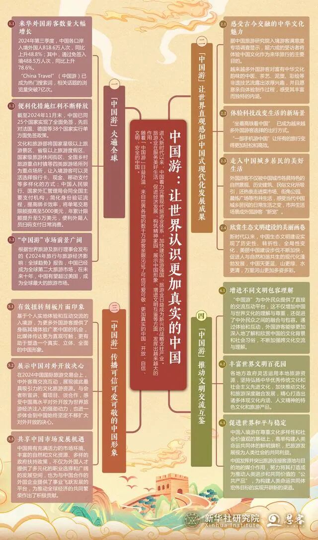 12月4日,新华社国家高端智库在海南博鳌举行的2024新华中经智库年会上发布《中国游:让世界认识更加真实的中国》智库报告,反映了中国入境旅游便利化措施取得的积极成果,阐释了“中国游”在展示中国形象、促进国际交流、增进文明互鉴等方面的重要意义。