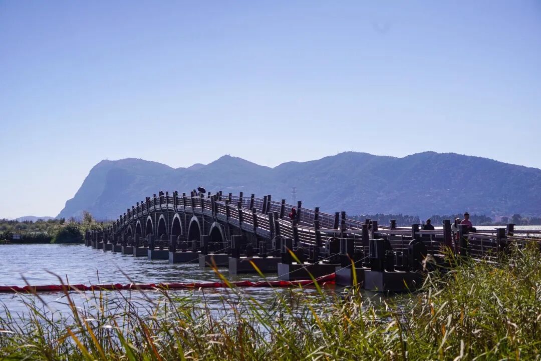 东风坝上的七孔浮桥,是昆明的网红打卡胜地之一,站在桥上看湖水的波光与山色温柔交织,好不惬意。