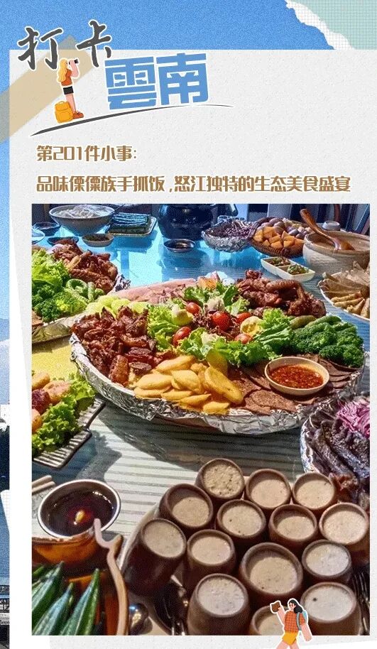 来到怒江,首先要体验的必定是充满傈僳族风情的手抓饭。傈僳族手抓饭是怒江傈僳族的特色美食,每到过节或者接待尊贵客人的时候,当地傈僳族就会烹饪满满一簸箕的珍馐美味。傈僳族手抓饭用大米与碎包谷粒、或豆米、荞米混合在一起煮(蒸)熟,伴之以火腿、洋芋、豌豆,有火腿的浓郁香味,也有豆的清甜,盛在铺满绿叶的簸箕上。