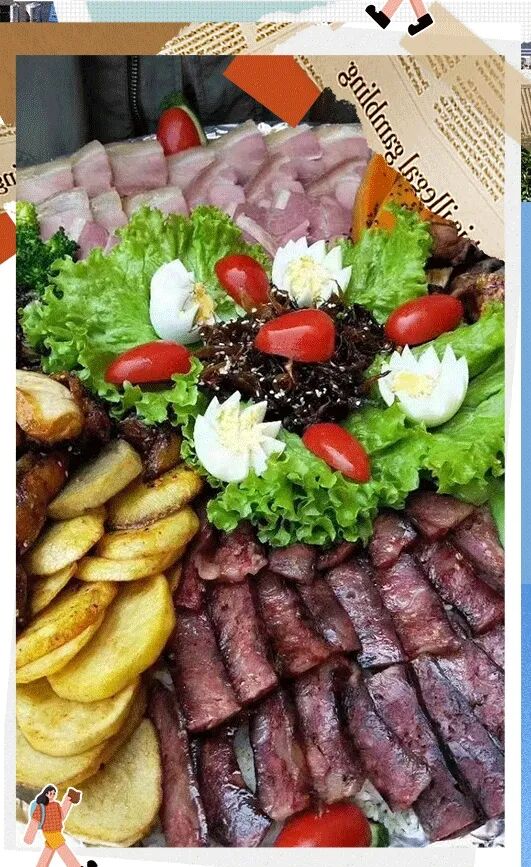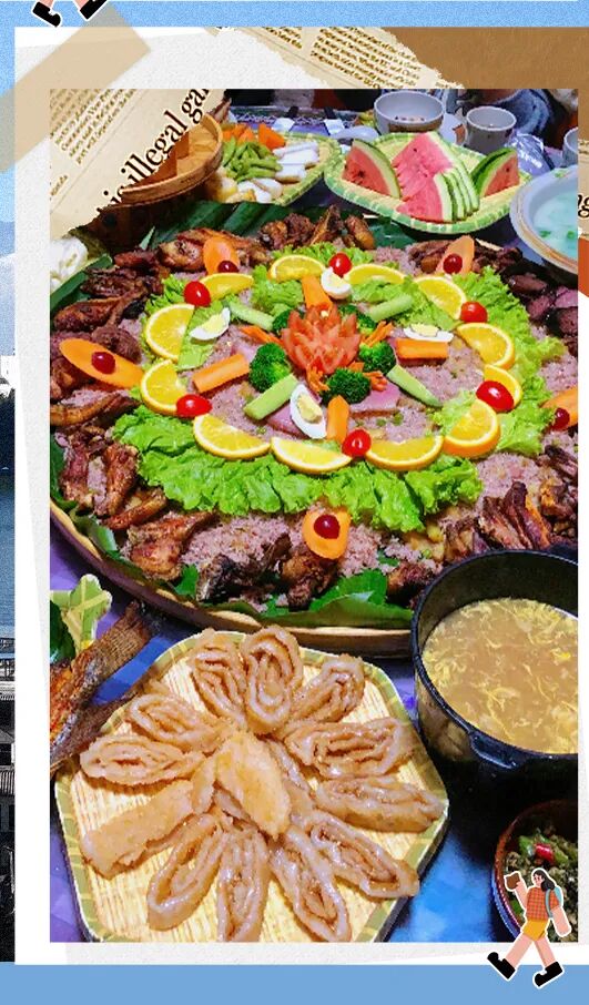 米饭上面从外到里依次盖上烤乳猪肉、鸡肉块、鸡蛋、腊肉、竹叶菜、菌子、木耳、花生、凉拌野菜、洋芋、洋丝瓜等各种肉和蔬菜,拼出了色彩诱人的“花心”。吃饭时,人们洗完手围着竹簸箕坐成一圈,左手为碗,右手为筷,先拈一片腊肉往左手掌上涂一层油,右手抓起自己想吃的东西放进左手里进行初步的组合,再喂进嘴里。
