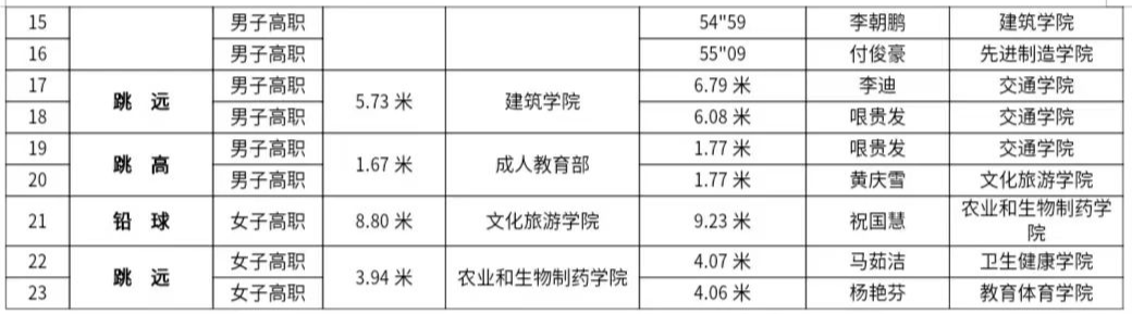 云南现代职业技术学院组别团体前三名为交通学院、农业和生物制药学院、教育体育学院,卫生健康学院、教育体育学院获体育道德风尚奖,文化旅游学院、交通学院获优秀组织奖。楚雄技师学院组别团体前三名为教育体育学院、交通学院、卫生健康学院,数字经济学院、卫生健康学院获体育道德风尚奖,农业和生物制药学院、教育体育学院获优秀组织奖。共有11个项目23人次刷新学院田径运动会纪录。