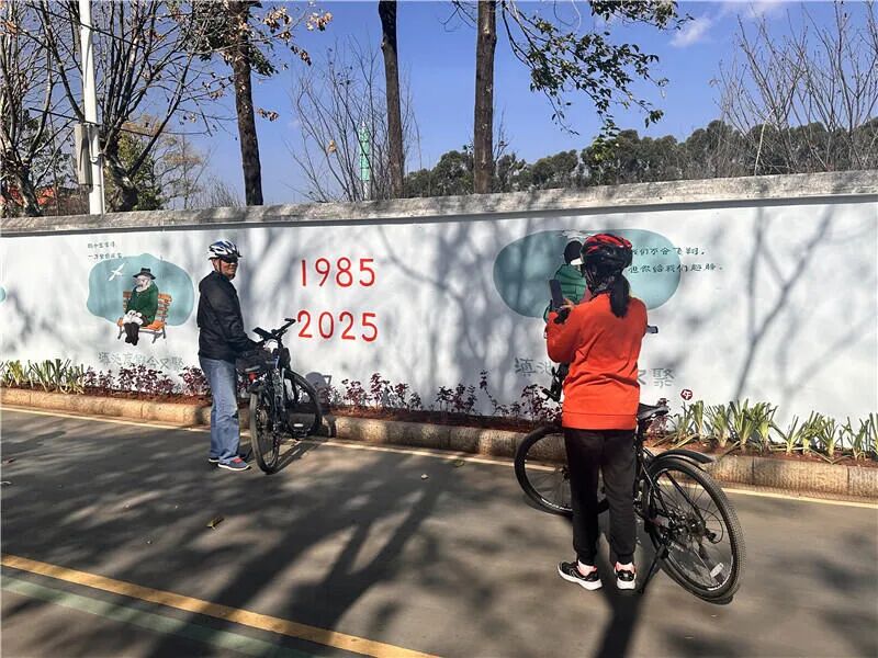 在海埂公园,由滇池文化大使李昆武老师创作的鸥遇春城四十周年墙绘,吸引不少游客驻足欣赏、打卡拍照。墙绘围绕红嘴鸥主题,呈现红嘴鸥历史、感人事件等内容,呼吁市民爱护红嘴鸥,实现人与自然和谐相处,也为游客了解红嘴鸥与昆明之间跨越时空的深厚联系,展现独特的城市人文魅力景观提供了新的文化渠道。画作分为三个部分,第一部分主题为“百年桉树,千里奔赴”,以海埂公园内生长的近百棵傲然挺立、冠盖如云的蓝桉树群以及海鸥为题材。第二部分画作主题为“我迎海鸥四十年,滇池度假今又聚”,经过李昆武老师的创作,生动描绘了海埂公园里市民游客喂海鸥、观海鸥的日常动态。第三部分画作主题为“遥远的飞翔,滇池的呼唤”,以水墨画加上海鸥画框的形式将老海埂风貌进行展现。